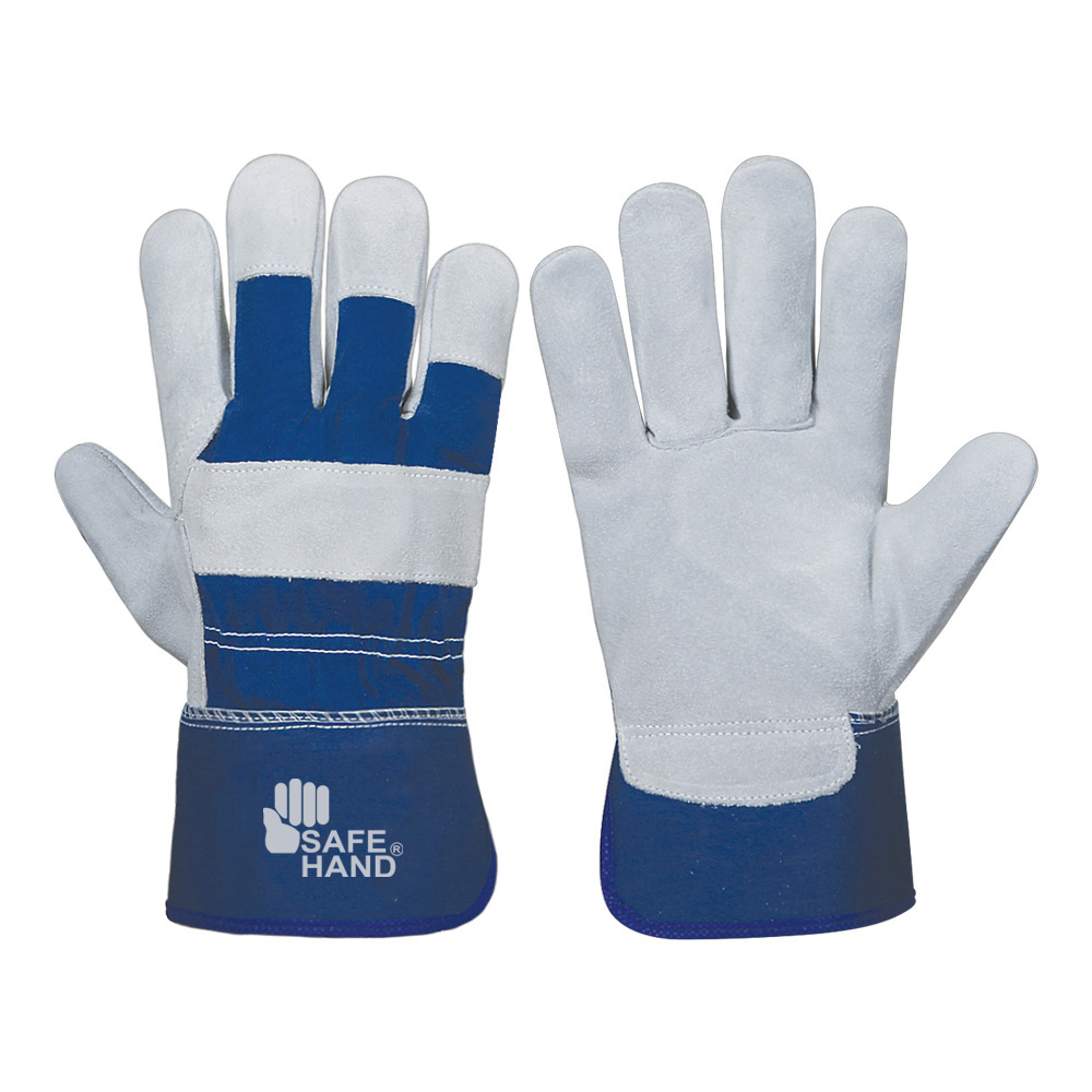 Canadian Rigger glove, Palm made of natural cow split leather back blue cotton, 3 finger tips and knuckle strap, rubberized cuff with blue piping on edge.