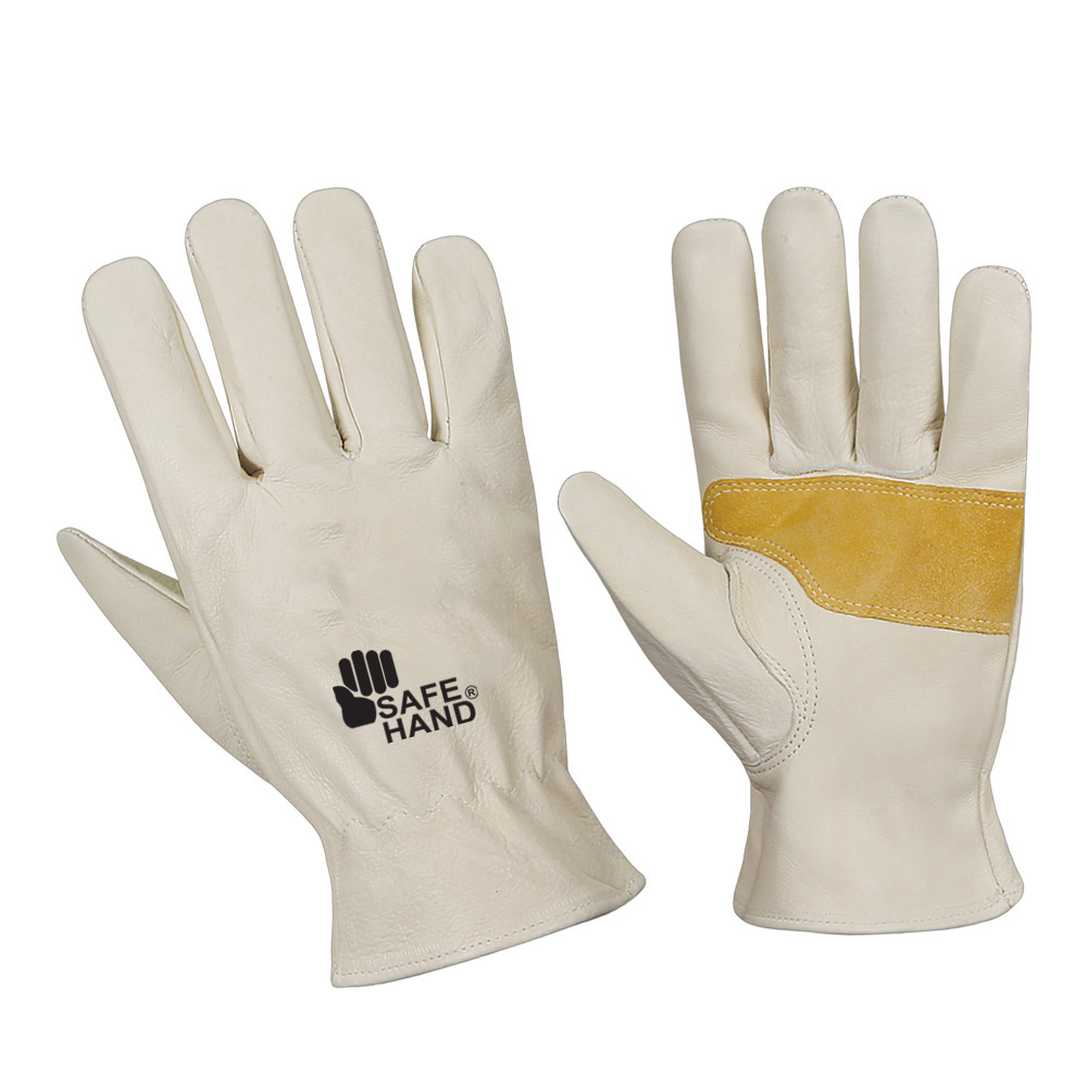 Driver’s glove, Palm & top made of natural cowhide leather, Key Stone thumb, extra cow split leather patch on palm, elastic on wrist, binding on edge.