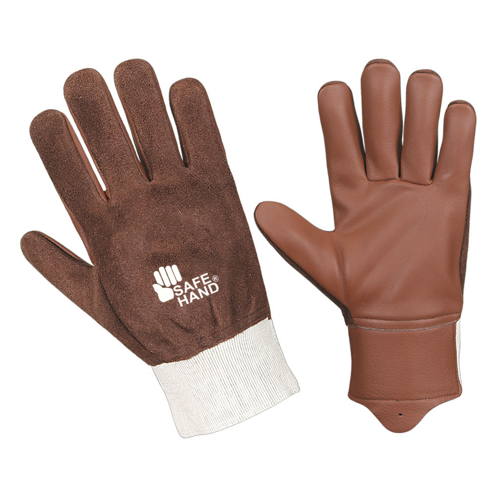Water Resistant Gloves, Palm made of chocolate color cowhide leather back chocolate color cow split leather, Wing thumb, and Latex cuff with pulse protection.