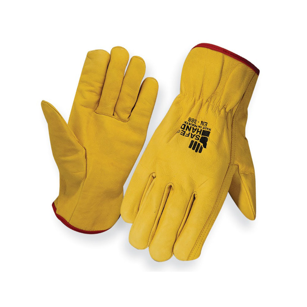 Driver Gloves M/O Yellow Cow Leather with Elasticated Back And Red Piping Stitched With/Without Kevlar Thread Grade = A, A+B Size = 9, 10, 11, 12