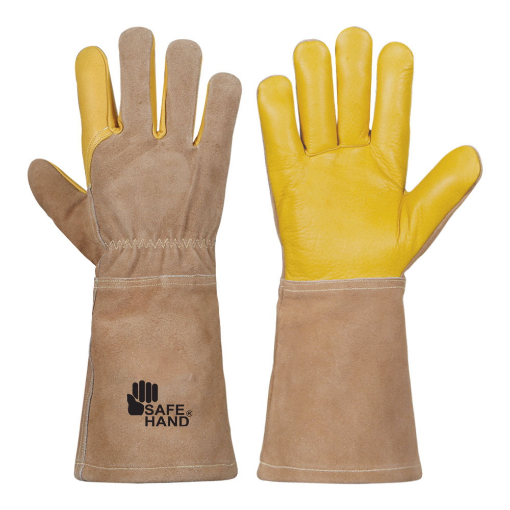 Welder’s glove, Palm made of yellow cowhide leather back brown cow split leather, Wing thumb, and brown cow split leather cuff, binding on edge.