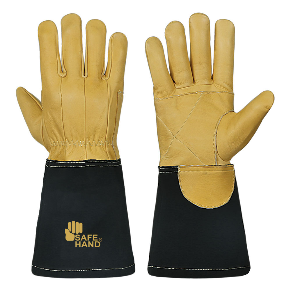 Welder glove, Palm & top made of yellow cowhide leather, Stitched thumb, reinforcement on palm with cross stitched, Black cow split leather cuff 14 cm, binding on edge, 35 cm long.