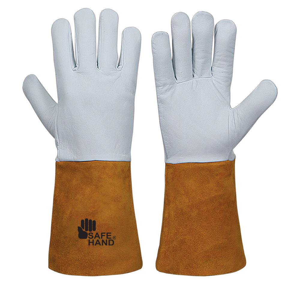 Welder’s glove, Palm & top made of natural goatskin leather, Wing thumb, Brown cow split leather cuff 14 cm, 35 cm long.