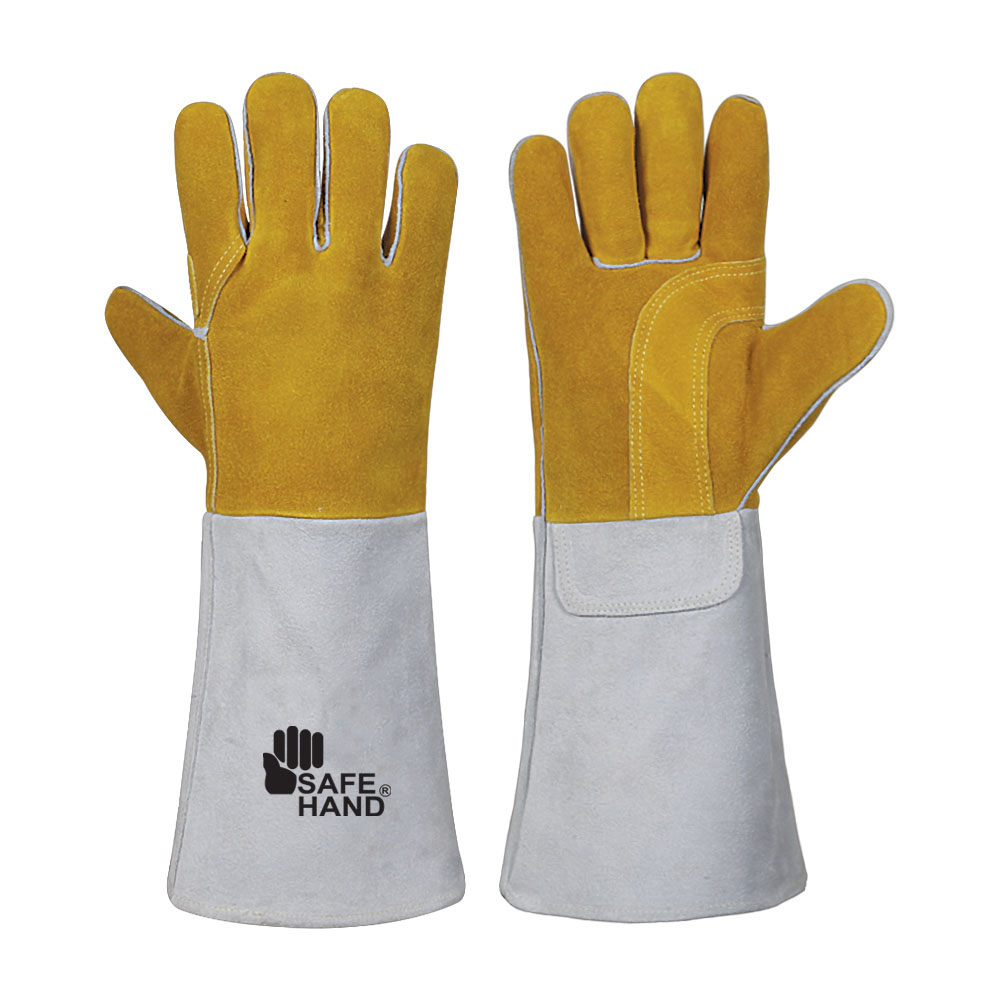 Welder’s glove, Palm & top made of golden cow split leather, Wing thumb, reinforcement round thumb with golden cow split leather, grey welts on seems, half fleece & half cotton lining, Natural cow split leather cuff 19 cm, 40 cm long.