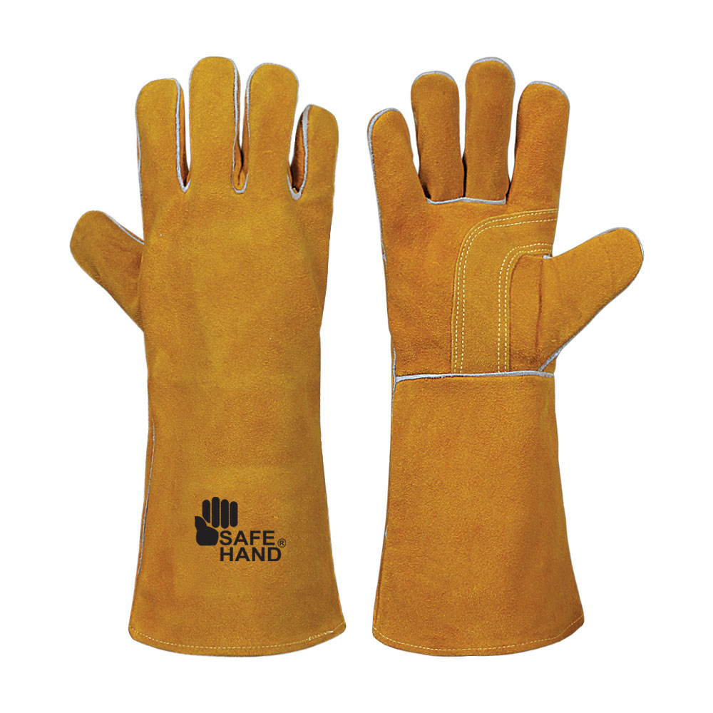 Welder’s glove, Palm & top made of golden cow split leather, Wing thumb, reinforcement round thumb with golden cow split leather, grey welts on seems, one piece back, half fleece & half cotton lining, 40 cm long.