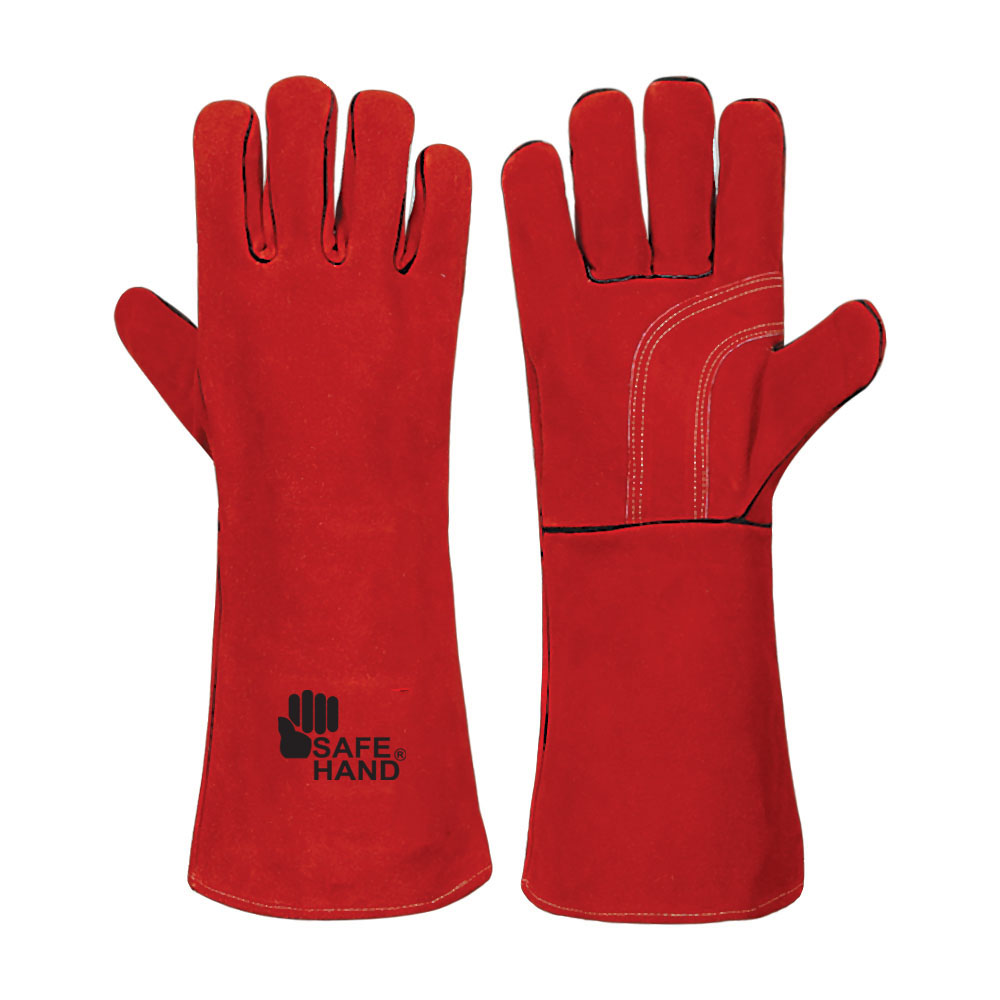 Welder’s glove, Palm & top made of red cow split leather, Wing thumb, reinforcement round thumb with red cow split leather, black welts on seems, one piece back, half fleece & half cotton lining, 40 cm long.