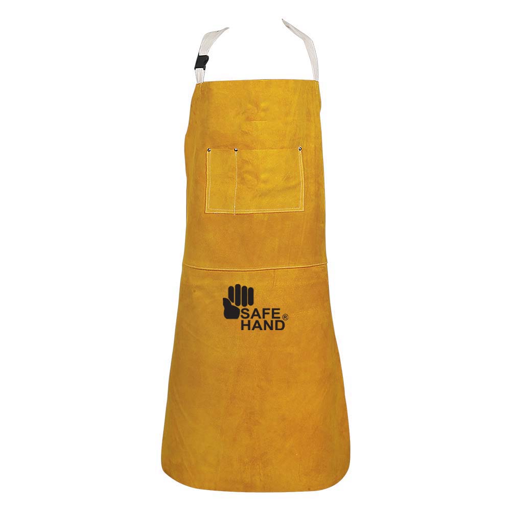 Welders Bib Apron made of golden cow split leather Cotton strap on neck, 2 pieces, stitched with Kevlar thread, 2 Pockets on front.