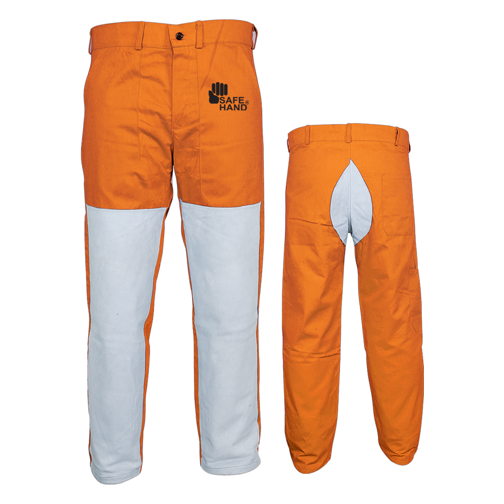 Welders Trousers made of orange cotton Fabric with grey cow split leather.